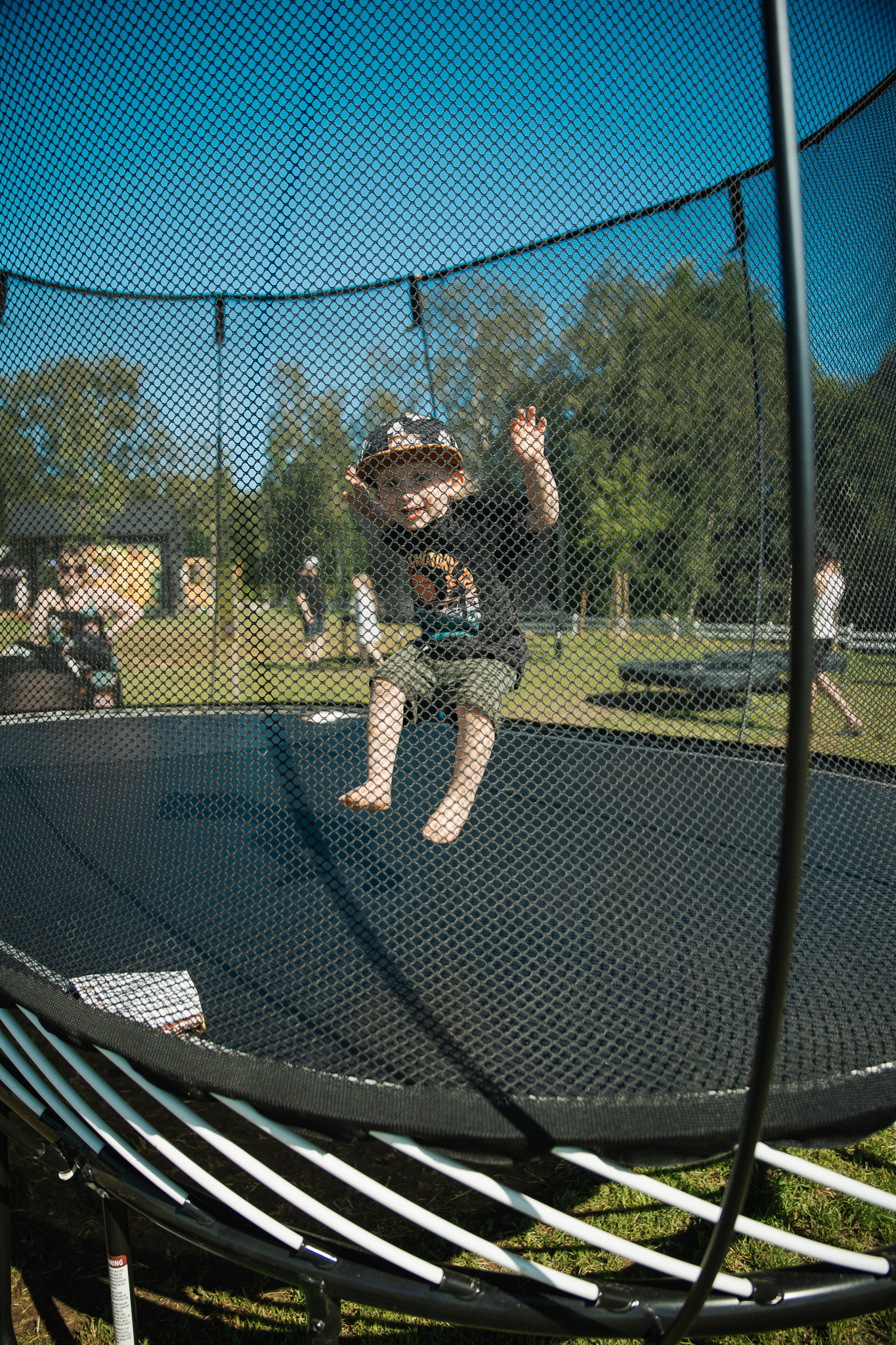 Kahvilan piha-alueen laitamilla on trampoliinipuisto erilaisine trampoliineineen. Täältä lapset löytävät takuulla mieleisen trampoliinin hyppimiseen.