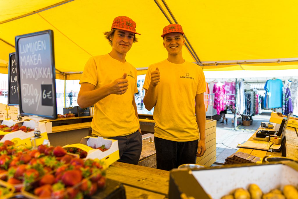 Torimyyjät Eevert ja Kaapo palvelevat asiakkaita ilolla. Poikien mielestä torilla on parasta se, kun saa tuoreilla tuotteilla ja hyvällä palvelulla asiakkaat hymyilemään.