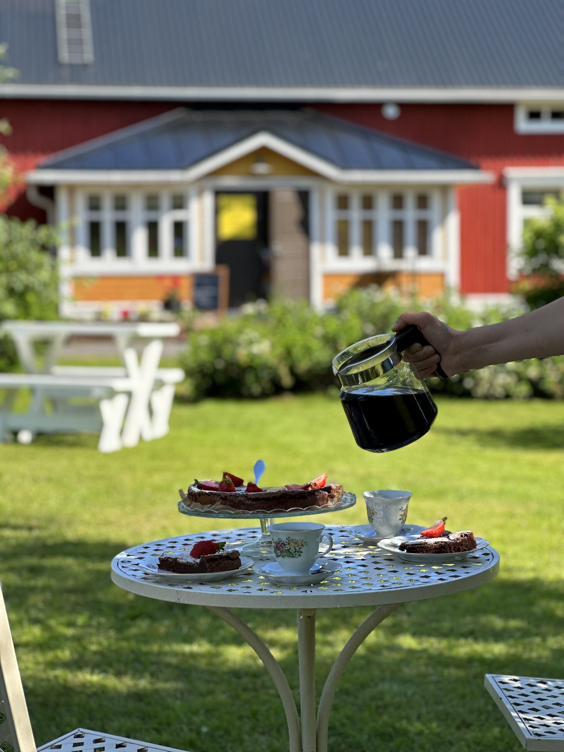 Kahvila sijaitsee elämyksien maatilamme ytimessä, vanhassa punaisessa hirsipirtissä, joka on rakennettu kyseiselle paikalle jo vuonna 1669. Kahvila tarjoaa Sinulle idyllisen maalaismiljöön lisäksi aurinkoista palvelua sekä suussa sulavia perinteisiä herkkuja, jotka valmistamme itse.