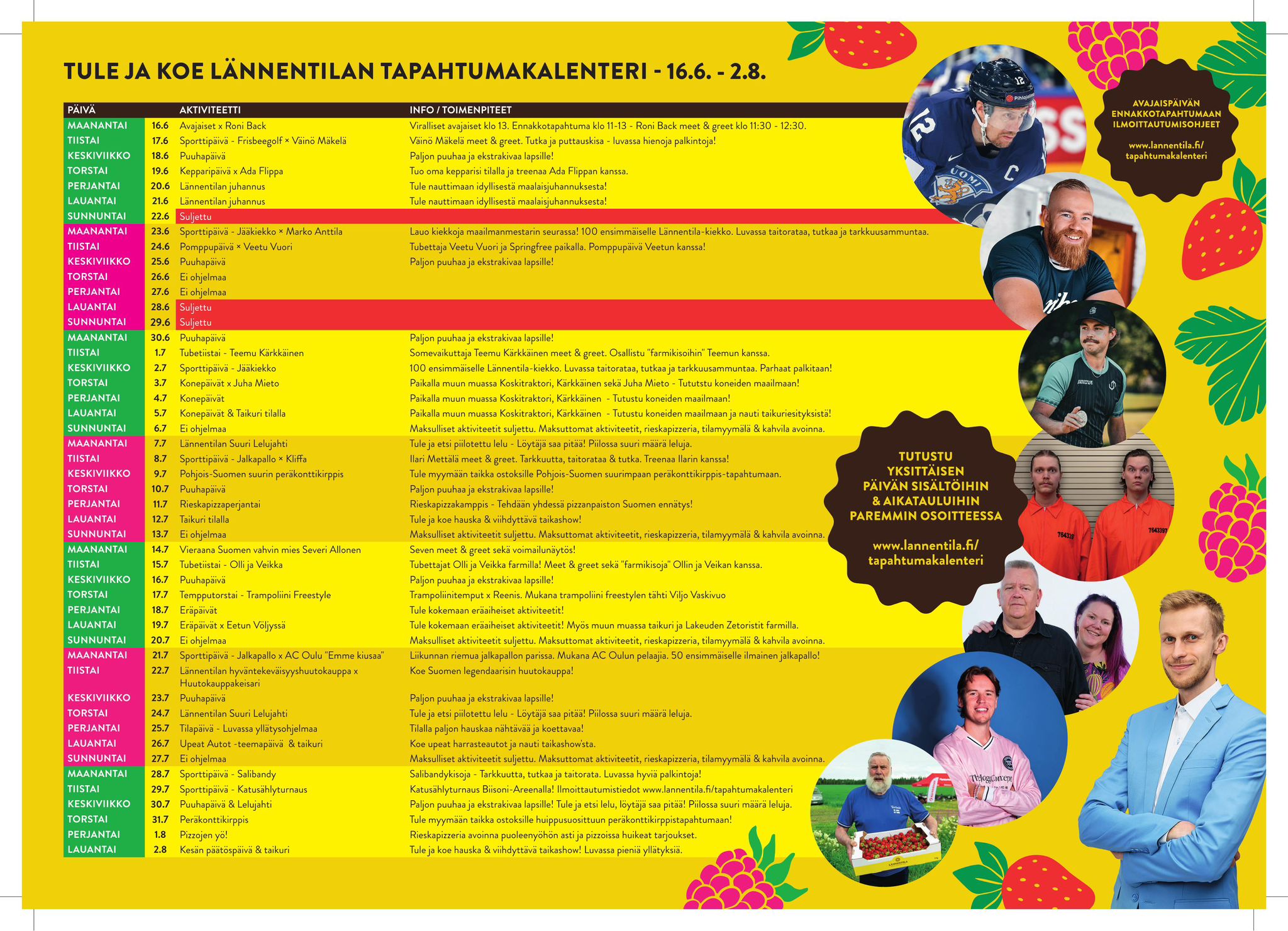 Alla päiväkohtaisesti avattuna kesän maksuton tapahtumakalenteri sekä tietoa siitä, mitä kaikkea erityistä tilan pihapiiristä löytyy päivittäin! Kaikki alla mainittu on ilmaista, ellei toisin mainita.